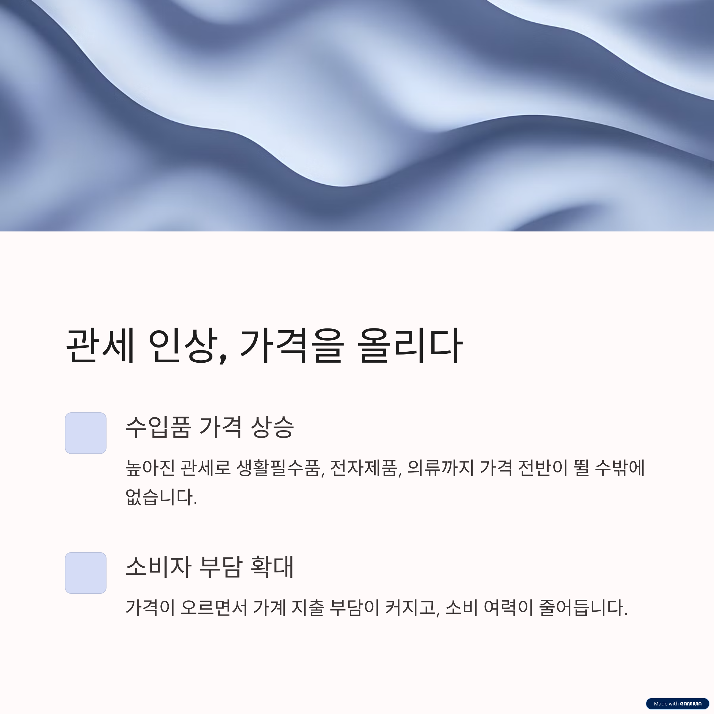 관세로 인해 식품, 의류, 전자제품 등 생활필수품의 가격이 오르고, 이는 곧 가계의 생활비 부담 증가로 이어집니다
