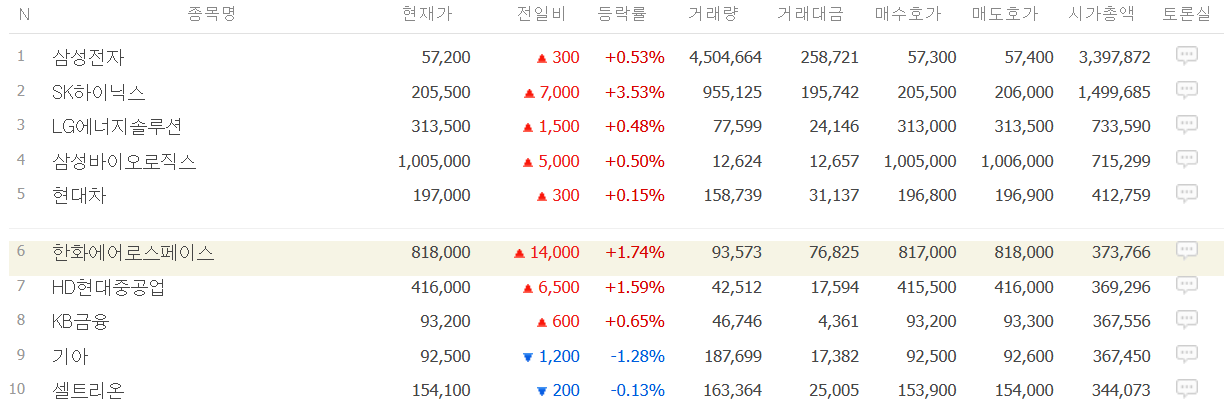 삼성전자(0.70%), SK하이닉스(3.78%), LG에너지솔루션(0.48%), 삼성바이오로직스(0.50%), 현대차(0.05%), 한화에어로스페이스(1.87%) 등이 상승했고, 기아만 소폭(-1.17%) 하락했습니다.
