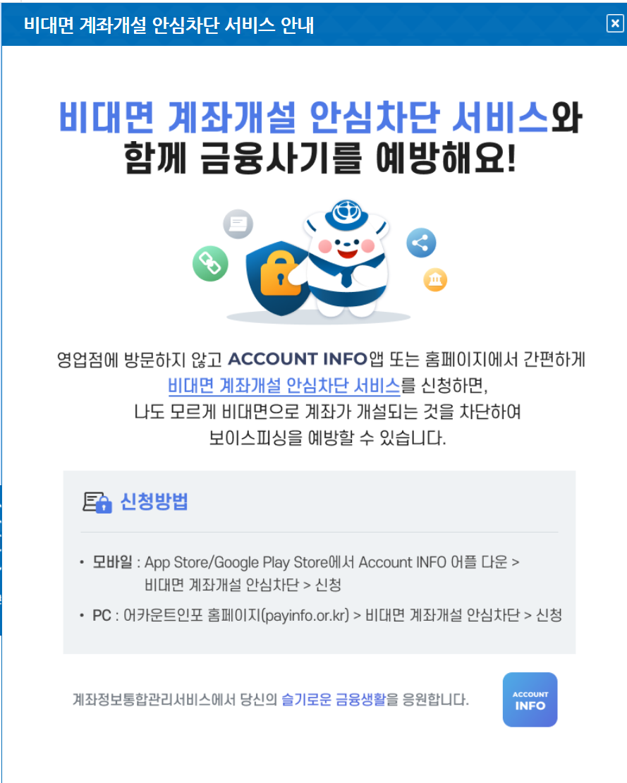 신청하면 바로 모든 금융권에서 비대면 신규 계좌 개설이 막힙니다. - 적용 범위가 넓음
