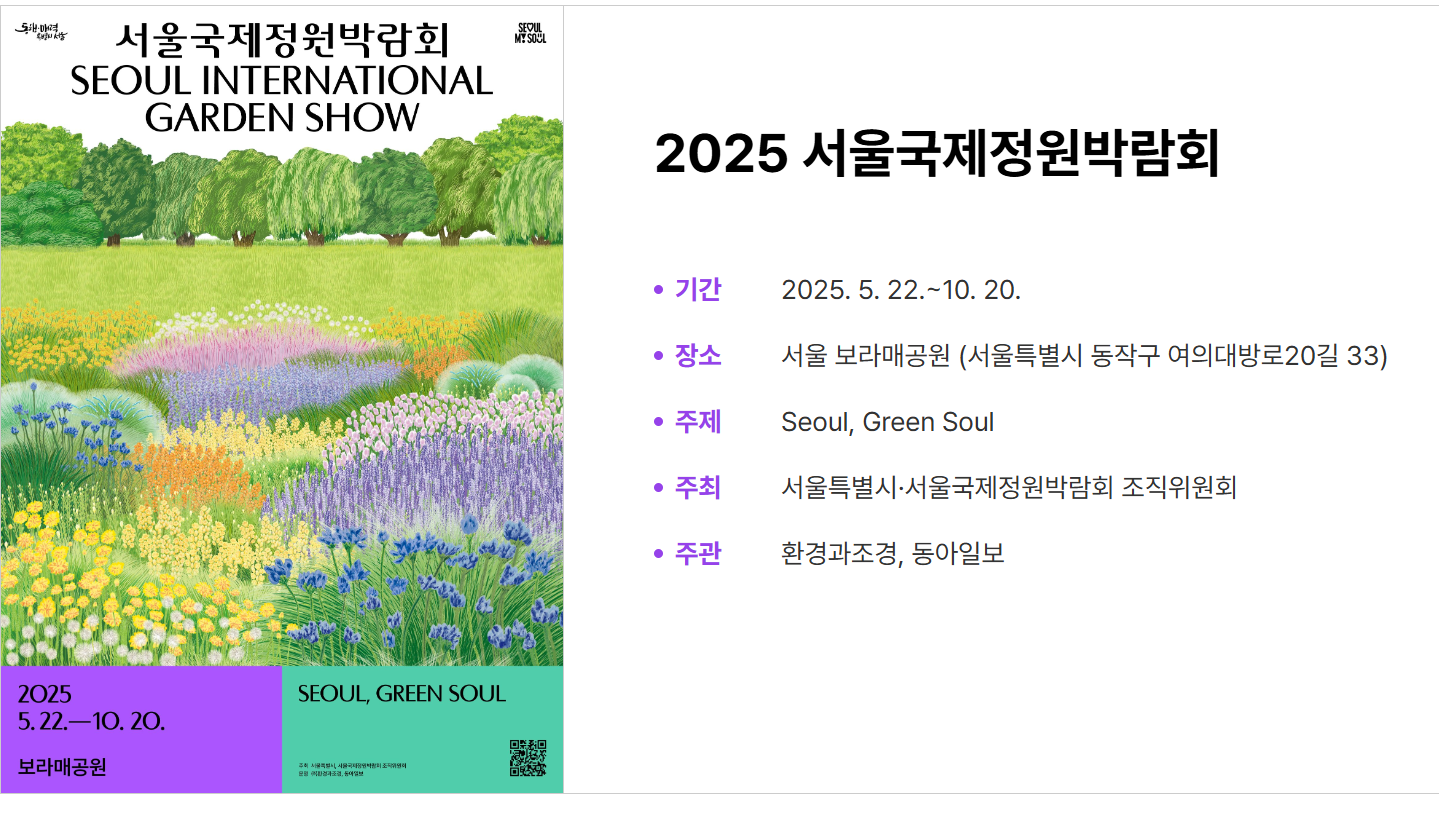 안녕하세요! 오늘은 2025 서울국제정원박람회에 방문하실 분들을 위해 행사장 가는 방법과 주차장 정보를 한눈에 보기 쉽게 정리해 드릴게요. 정원과 자연을 사랑하는 분들이라면 꼭 한 번 들러야 할 이번 박람회, 미리 교통편을 체크하고 여유롭게 다녀오세요!