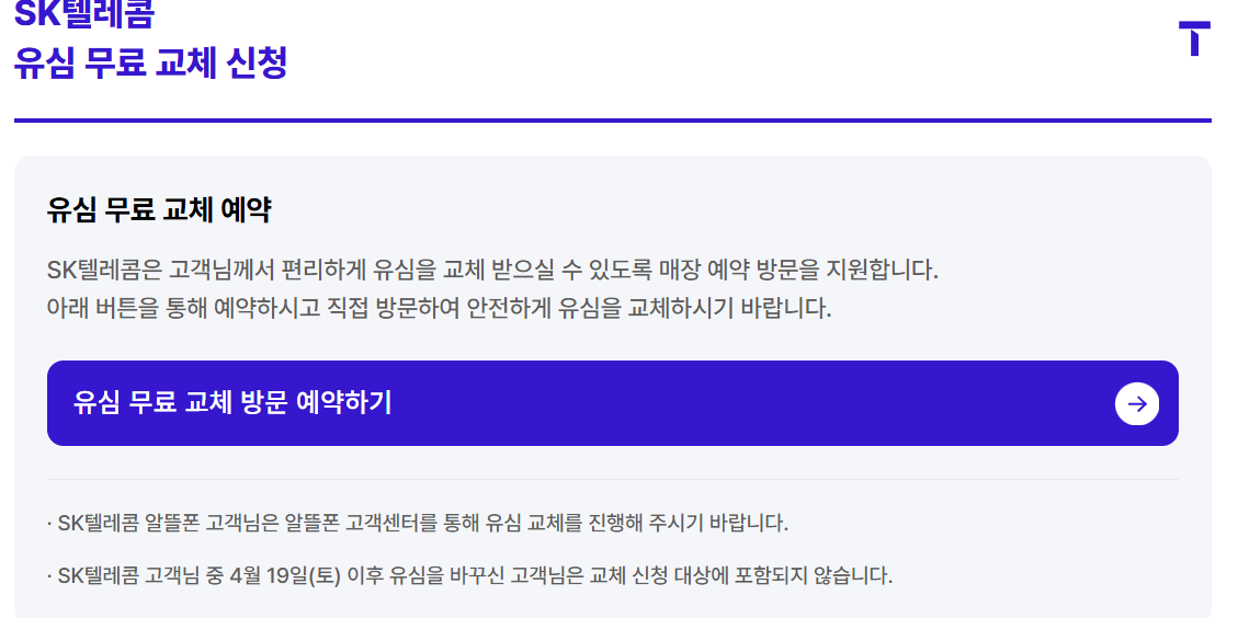 - 4월 19일~27일 사이 자비로 유심 교체한 고객은 비용 환급 가능(별도 안내 예정)
